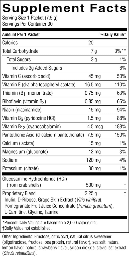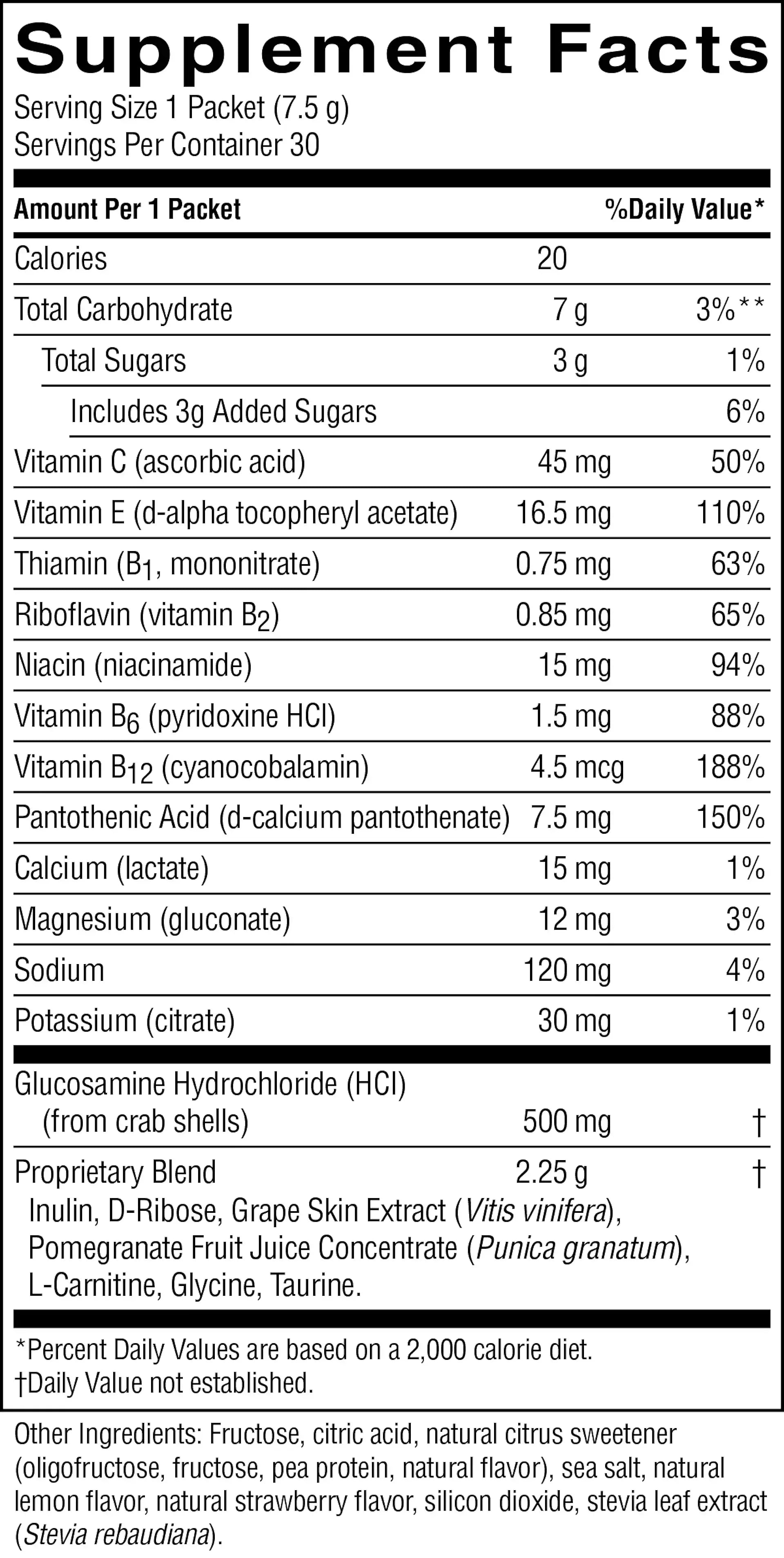 Vitamin C, vitamin E, thiamin (B1), riboflavin (B2), niacin, vitamin B6, vitamin B12, pantothenic acid, calcium, magnesium, sodium, potassium, glucosamine, fructose, chicory root fiber, d-ribose, natural citrus sweetener, sea salt, natural flavors, stevia leaf extract, grape skin extract, pomegranate fruit juice concentrate, l-carnitine, l-taurine and l-glycine.